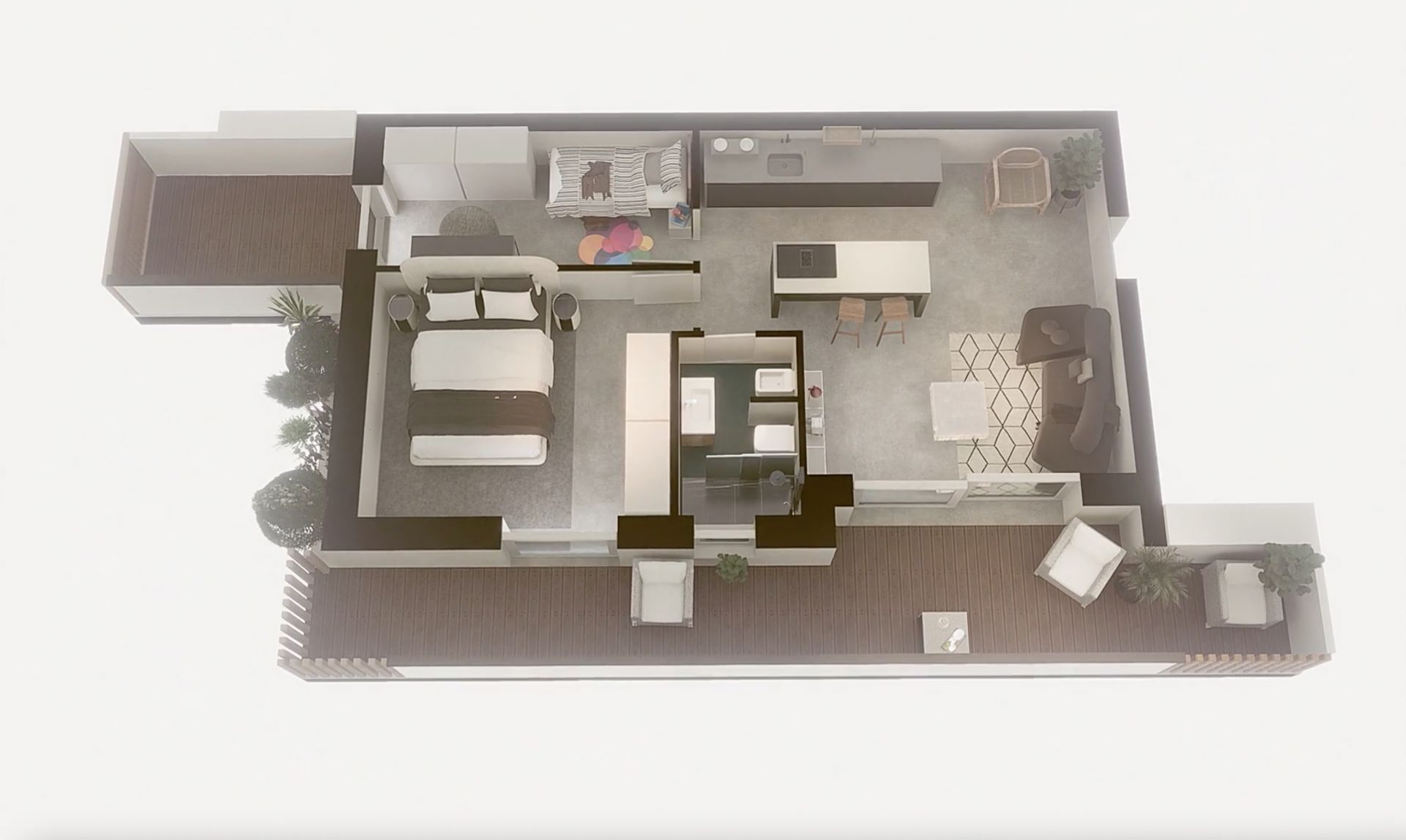 Appartamento composto da zona giorno open-space, due camere da letto e un bagno.